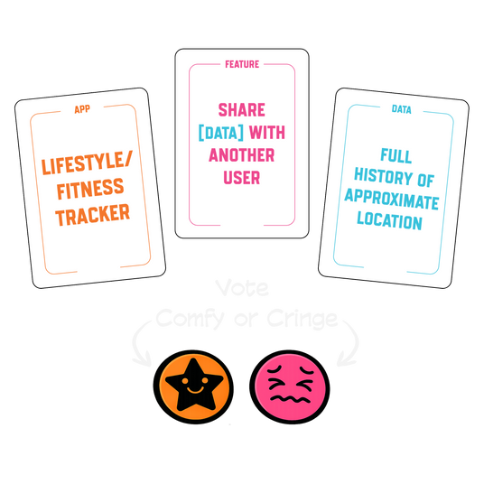 Players build product scenarios using three card types: App, Feature, and Data, aiming to minimise their own “cringe” while sabotaging others with awkward or amusing combinations. The game sparks laughter, debate, and meaningful discussion about privacy expectations and user trust.